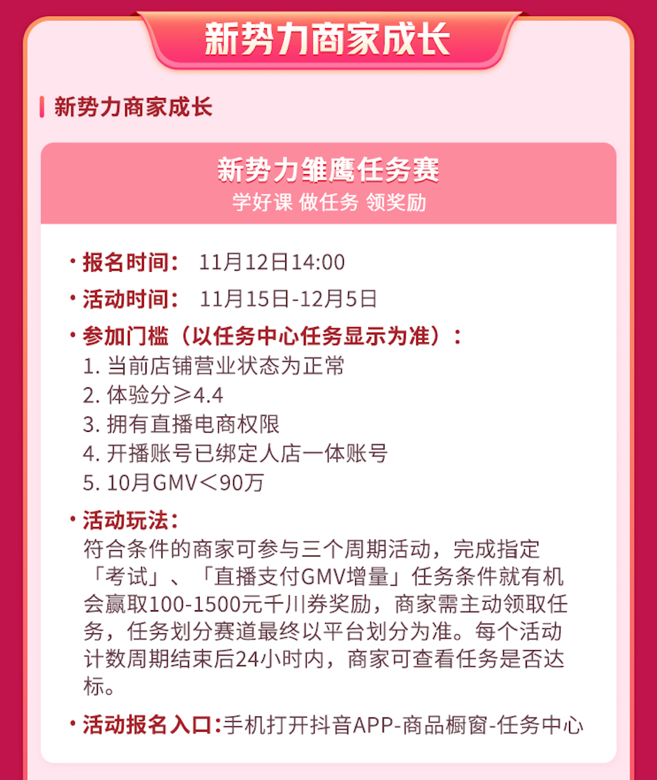 目前,抖音双12好物狂欢季正在火热招商中。该大促活动也为新势力商家带来了多种玩法和丰厚的平台福利。赶快参与报名,将在「新势力雏鹰学习任务赛」中的所学、所获转化为生意新增量吧!