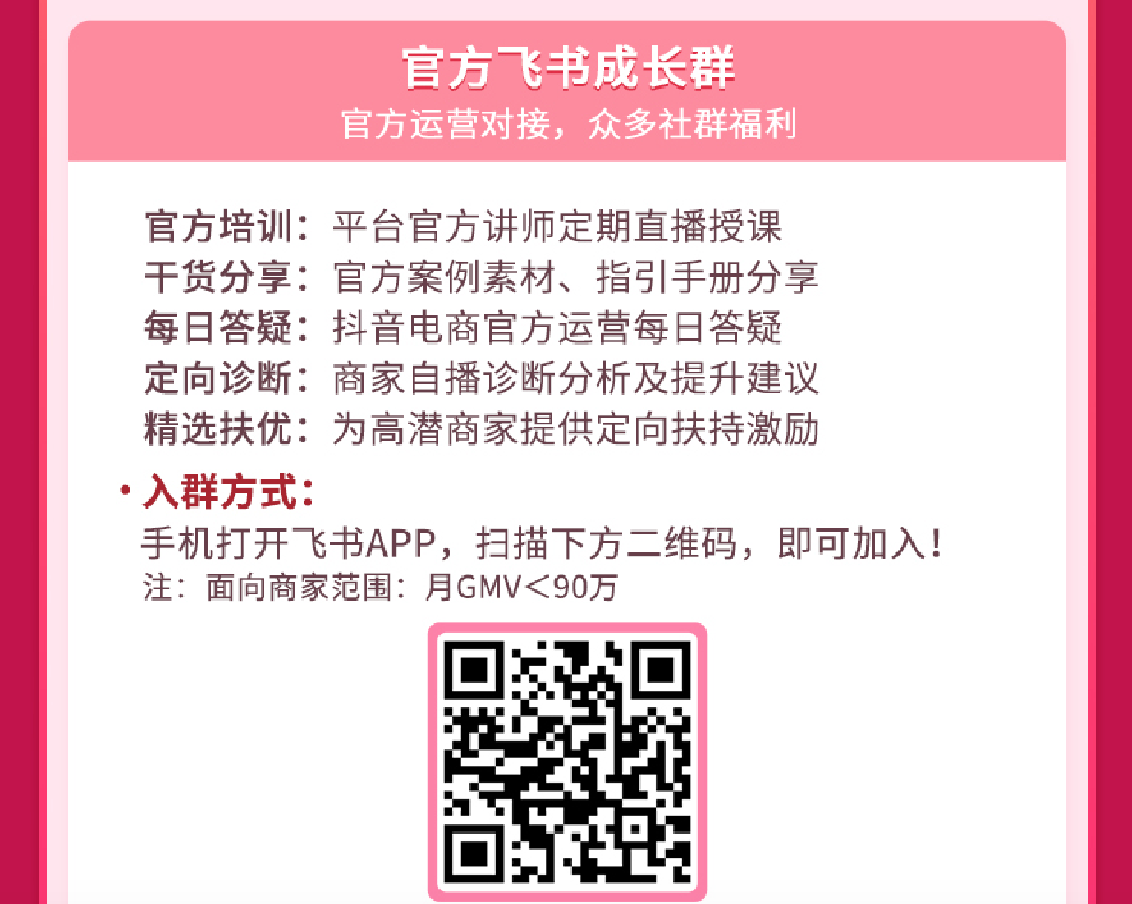 通过加入官方飞书成长群,新势力商家可享受抖音电商学习中心认证讲师定期直播授课、平台官方运营每日答疑、商家自播诊断分析及提升建议等多重福利。同时,在本次「新势力雏鹰学习任务赛」中,参赛商家还能在飞书群中实时交流、分享参赛经验,获得高效提升。