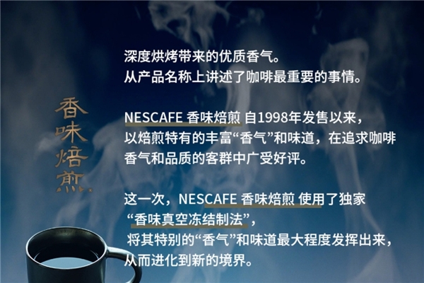 “香味焙煎” 咖啡以带给大众“茶歇质感”的速溶咖啡为己任。雀巢咖啡将一些小众的、独特的、有惊艳感的元素浓缩到“香味焙煎”咖啡当中,在保留黑咖啡原味的同时使其更符合年轻人的口味。这样的创意使得“香味焙煎”咖啡深得日本年轻白领群体的喜爱:“真的很方便,就算每天加班也能喝到京都咖啡店级别高品质咖啡的味道。”——来自东京的80后白领小爱如是说道。