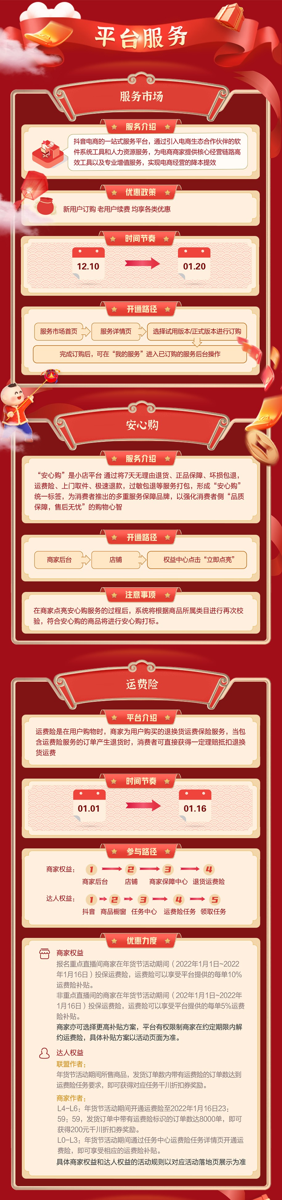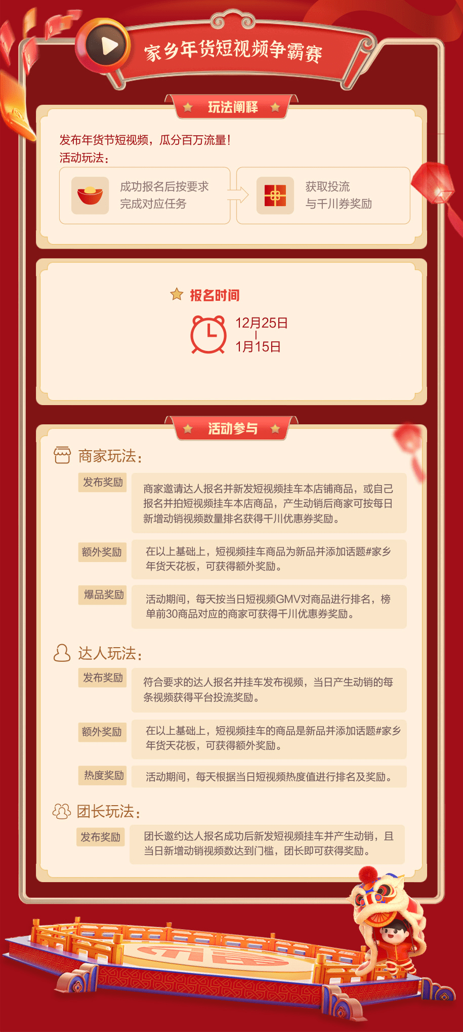 抖音好物年货节将于2022年1月1日正式开始,并于1月16日结束。活动期间,抖音好物年货节还将推出好物直播间、家乡年货短视频争霸赛、全民任务赛、巅峰任务赛等多种玩法及平台技术服务费限时返还、百亿补贴等多重运营支持政策,帮助合作伙伴快速达成销售目标。