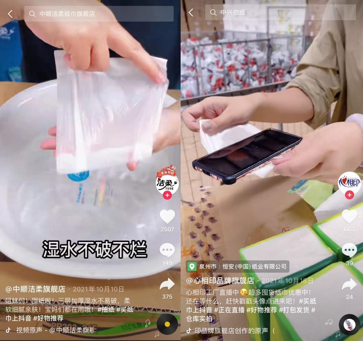 据相关调研数据显示,短视频内容营销和直播内容营销是当下用户接触感知度最高的两种营销方式。伴随着短视频、直播的飞速发展,纸品、卫品也不再只是陈列在货架上的刚需消耗品,而是可以借助这样的画面直观展示自己的商品特性,从而触达更多潜在消费人群,拓展全新增长空间。