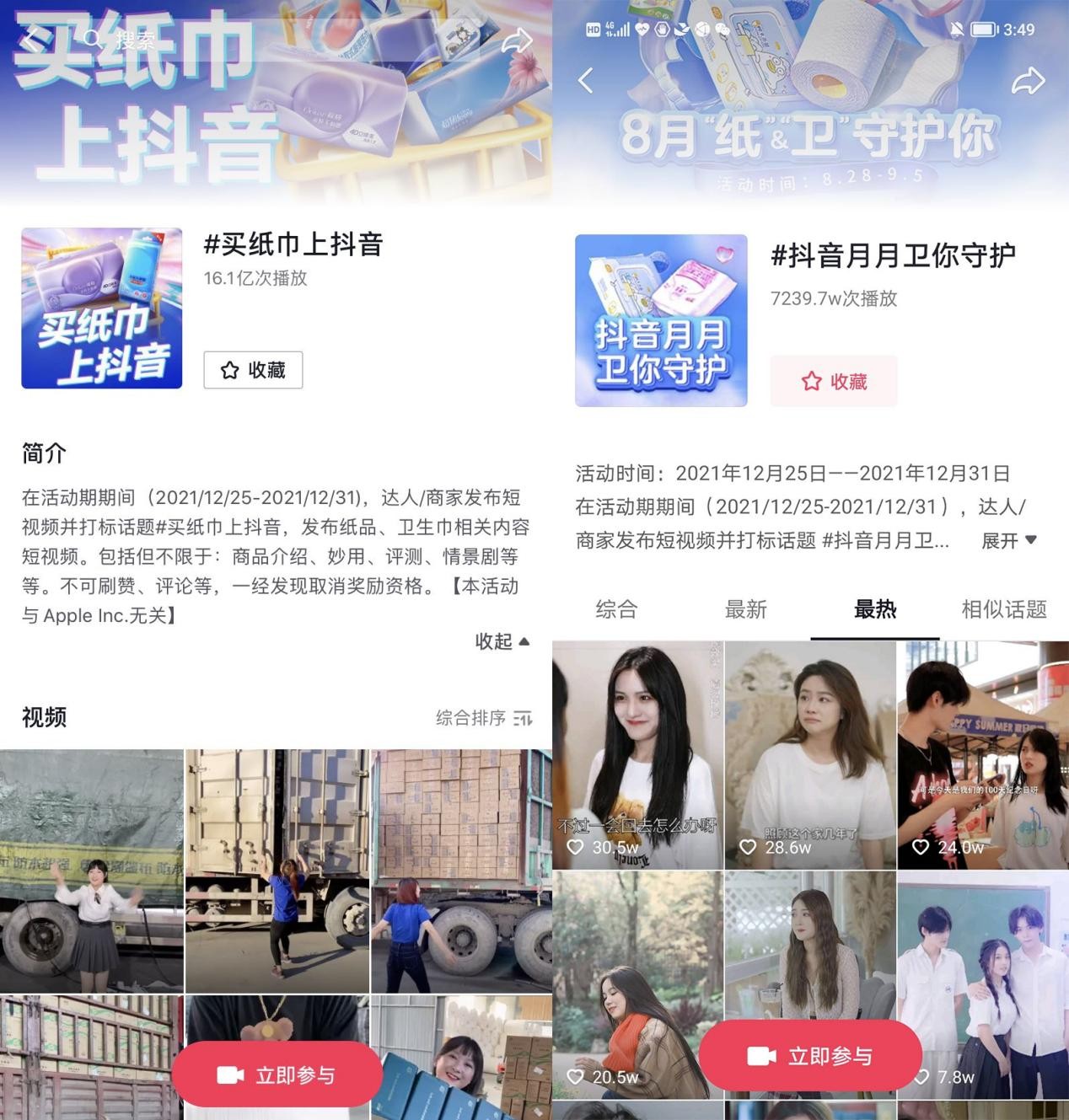“‘纸’‘卫’守护你”系列活动相继推出了短视频挑战赛、短视频点赞大赏等多种玩法及#买纸巾上抖音、#抖音月月卫你守护两大话题,帮助纸卫品商家拓展消费人群。该两大话题之下,聚拢了众多纸卫品商家花式展示自家产品的高品质。截止目前,“买纸巾上抖音”下的短视频播放量已超16.1亿次;“抖音月月卫你守护”话题已获超7千万次播放。